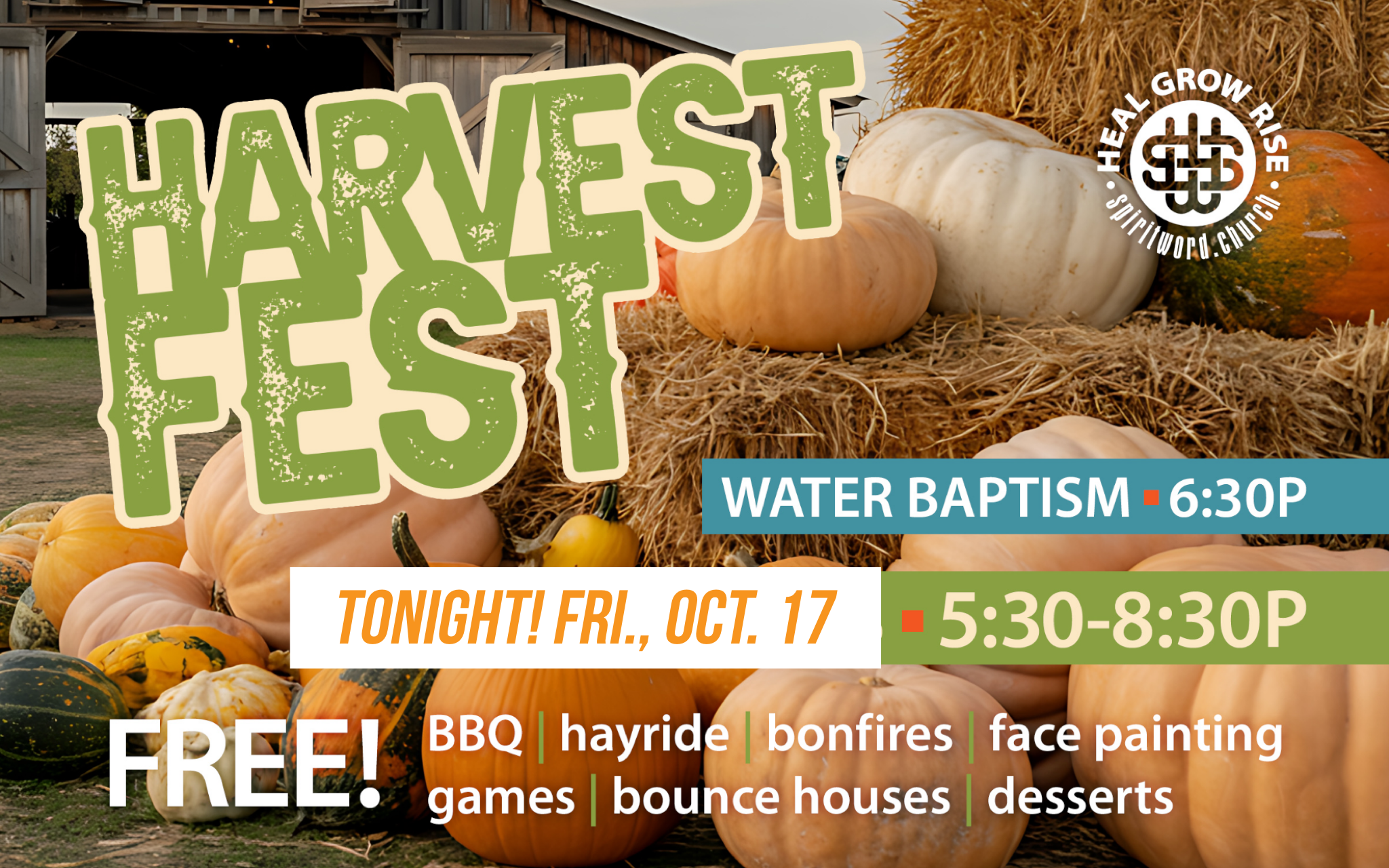 Join us on Fri., Oct. 17, 5:30-8:30pm for our 4th annual Harvest Fest with a ton of FREE FALL FUN for the entire family! Hayrides, S'mores, Bounce Houses, Games, Face Painting & FREE BBQ. Bring your favorite dessert. Plus, water baptisms at 6:30P. We can't wait to see you there!